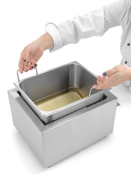 Рабочая камера состоит из жарочной ванны, в которую погружается решетчатая корзина с длинной изолированной ручкой, изготовленной из нержавеющей стали. В корзину для картофеля фри помещают продукты и затем погружают их в кипящий жир для приготовления. У фритюрницы для кафе рабочая камера условно поделена на горячую и холодную зоны. В горячей зоне происходит процесс жарки, а в холодной - оседание отслоившегося и обугленного фритюра, тем самым обеспечивая длительное хранение масла. V-образный контейнер для жира увеличивает размер «холодной зоны».