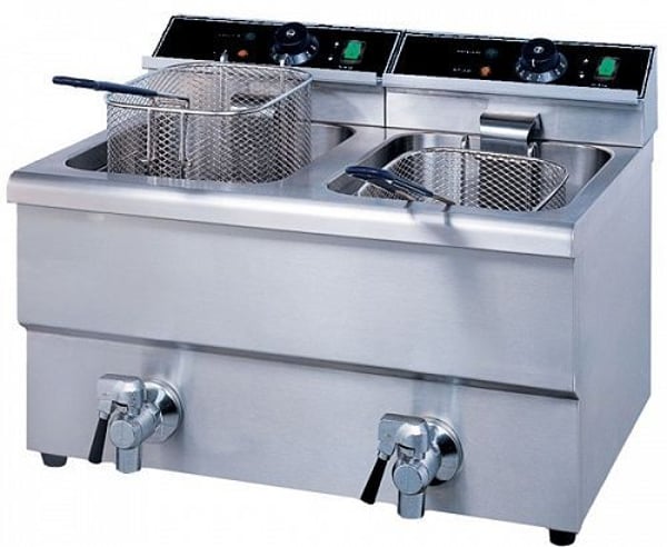 Двопостовая фритюрница состоит из емкости, которая плотно накрывается крышкой, съемной корзины и блока управления, с кранами для слива масла. Данная модель с двумя ваннами каждая на 12 литров.