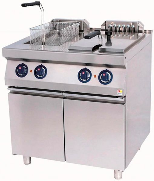 Двопостовая напольная фритюрница состоит из емкостей, которые плотно накрываются крышкой, съемными корзинами и блока управления. Стальная прочная корзина оборудована термоизолированной ручкой. Аппарат легко разбирается для санитарной обработки. Корпус выполнен из высококачественной нержавеющей стали.