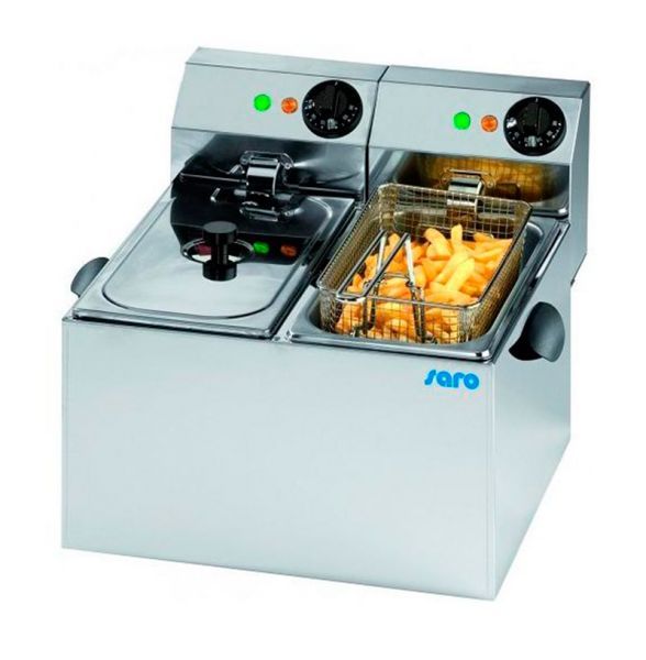 Встроенные индикаторы питания и нагрева позволяют контролировать процесс приготовления. Электронная панель управления находится с фронтальной стороны аппарата. Включается фритюрница терморегулятором, плавная регулировка нагрева от 70 до 190 ° С.