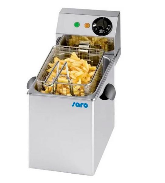 Встроенные индикаторы питания и нагрева позволяют контролировать процесс приготовления. Электронная панель управления находится с фронтальной стороны аппарата. Включается фритюрница терморегулятором, плавная регулировка нагрева от 70 до 190° С.