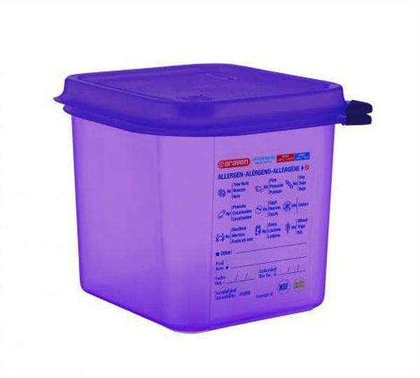 Фиолетовый цвет герметичного гастроконтейнера идентифицирует и дифференцирует пищу клиента, страдающего аллергией или пищевой непереносимостью, позволяет отделить ее от остальной части гастроконтейнеров и защитить ее от возможного перекрестного загрязнения веществ, потенциально аллергических. При правильной идентификации - это гарантия не попасть в эту группу риска. С помощью специальной постоянной марки идентифицируется аллерген в герметичной гастроемкости GN 1/6, сохраняя при этом все, что гарантирует питание для клиентов, страдающих пищевой аллергией или непереносимостью. Кроме того, полная воздухонепроницаемость пищевого контейнера специально разработана для обеспечения максимальной гарантии и защиты продуктов от риска заражения из-за перекрестного загрязнения пищевыми аллергенами.