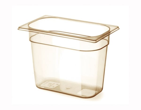 Прозрачная гастроемкость светло-желтого цвета имеет высокую ударостойкость, не впитывает запах и вкус продуктов, устойчива к высоким температурам.