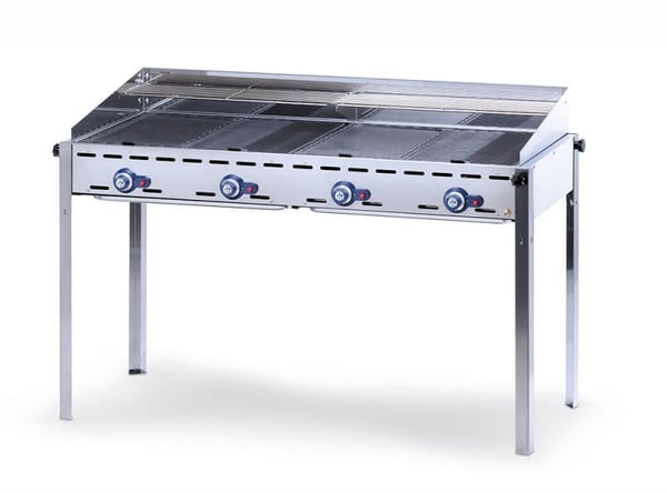 Профессиональный газовый гриль имеет прочную конструкцию, хорошо защищен от ветра. Улучшенные горелки гарантируют оптимальное распределение тепла на 90 % поверхности гриля. Очень чистое пламя, низкий уровень выбросов CO2.