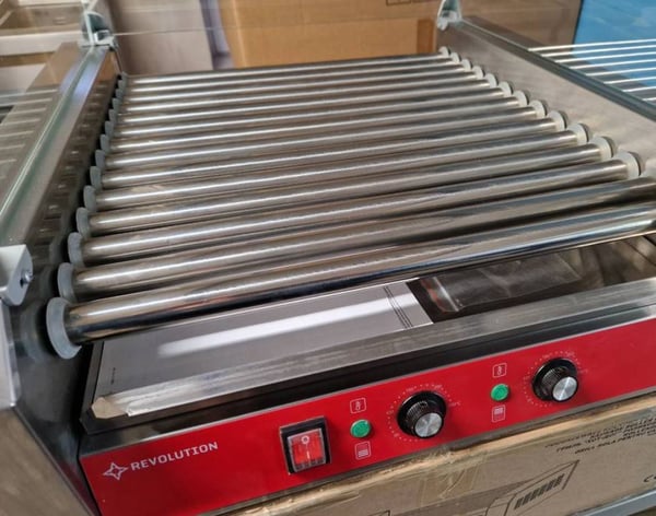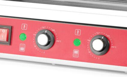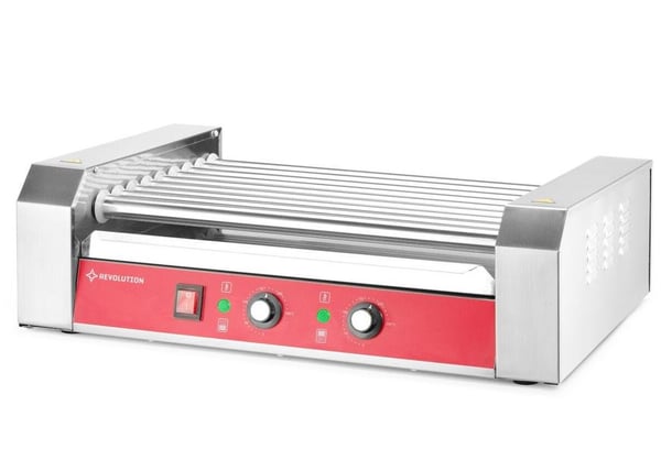 Ролики гриля могут быть с антрипригарным и хромированным покрытием, которые нагреваются изнутри своим ТЭНом, что обеспечивает равномерную температуру по всей нагревающей поверхности. Изделия, уложенные между двумя роликами, поджариваются равномерно со всех сторон благодаря непрерывному вращению. Прост и незаменим в эксплуатации. Легко поддается санитарной обработке, имеет небольшие размеры и отлично подойдет для общепита любого уровня. Часто роликовые грили применяются для обжаривания сосисок в комбинации с прижимными контактными грилями, которые подогревают булочку для получения хрустящей корочки и придания хот-дога аппетитной формы.
