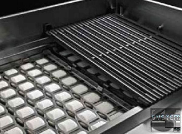 Нагрев происходит благодаря тройному безупречному пламени из двух независимых стальных горелок (каждая нагревает половину поверхности) управляемых клапаном безопасности, пилотом и термопарой. Горелки нагревают керамическую поверхность камней для отражения тепла.