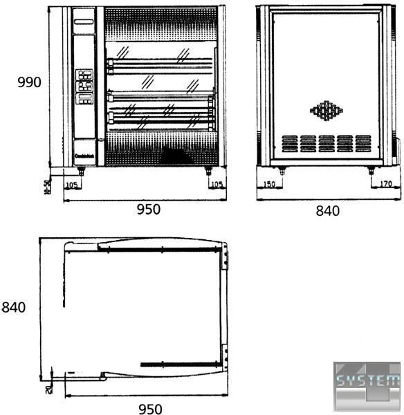 Сделан из листа н/с AISI 304. 2 двери с двойным стеклом и легкое открытие внутреннего стекла. Полностью автоматический, карта с электронной программой (7 различных программ жарки) с сенсорным экраном управления. Переключатель безопасности прекращает работу при открытых дверях. Термостат безопасности прекращает подачу энергии в случае перегрева. Равномерное распространение тепла благодаря вентилятору, кроме нагрева и освещения посредством 2 галотермических ламп мощностью 1000В. Оборудован поддоном для сбора масла, который легко выдвигать и чистить, а также поддоном для размещения кур.