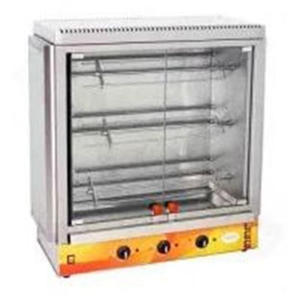 Предназначены для приготовления куриных тушек или их частей (крылышки, ножки, окорока и т.д.), рыбы, методом тепловой обработки излучением инфракрасного спектра. Продукты готовятся с минимальными потерями времени, веса и вкусовых качеств. Регуляторы мощности нагревательных элементов каждого вертела (шампура) облегчают установку нужного режима приготовления, а в часы минимального притока покупателей грили могут работать в режиме тепловой витрины, сохраняя продукты в горячем состоянии перед продажей. Освещение рабочего пространства в сочетании с большой площадью стеклянных дверей улучшают демонстрационные характеристики и способствуют увеличению продаж. Прямой привод от редуктора на каждый вертел уменьшают потери при поломке одного из двигателей (для грилей с количеством вертелов больше 1-го).
