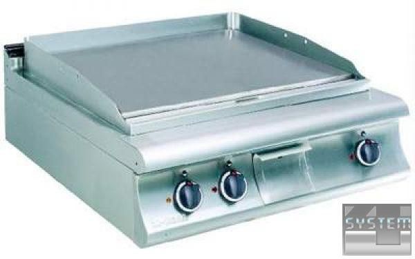 Основная часть сделана из сатинированного хромоникелевого листа 18/8 н/с, а внутренние принадлежности – из алитированного листа. Спереди жарочной поверхности находится канал для сбора масла и выпускное отверстие. Собранное с поверхности масло стекает в выдвижной ящик, который легко чистить. Имеются бортики с трех сторон для того, чтобы предотвратить расплескивание жира во время процесса жарки. Отдельный контроль поверхности посредством двух отдельных ручек управления. Все электрические механизмы и приборы соответствуют международным стандартам. Температура регулируется в пределе 50-300 °С посредством многоуровневого термостата и предохранительного термостата 350 ° C . Основной переключатель используется для подачи или прекращения энергии. Пригодна для многофункционального использования со шкафом (с дверьми или без) или на консоли для установок изолированного типа.