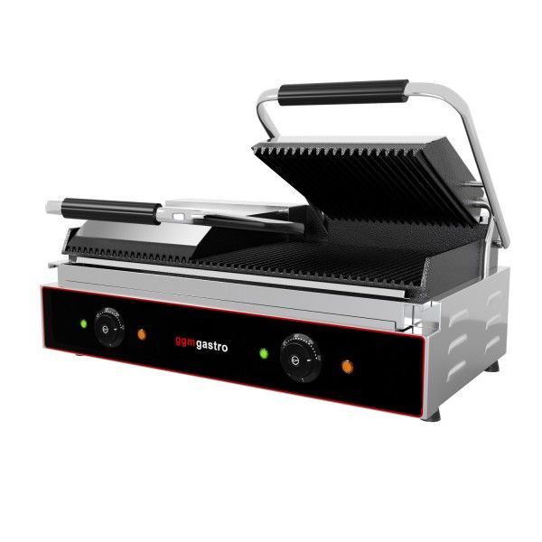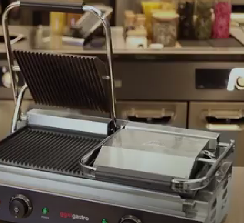 Двопостовой контактный гриль используют для приготовления и жарки широкого спектра продуктов, он предназначен для жарки мясных, рыбных и овощных блюд без использования посуды. Эти аппараты также называют panini, в переводе с итальянского означает "горячий бутерброд". Принцип работы прижимного гриля состоит в том, что обжарка продукта происходит одновременно с двух сторон, что вдвое сокращает время приготовления. Рекомендован для оснащения небольших закусочных, снек-баров, заведений фаст-фуда, где быстро происходит разогрев и обжаривание гамбургеров, сосисок, тостов, а также можно использовать для подогрева донер-кебабов, шаурмы, панини.
