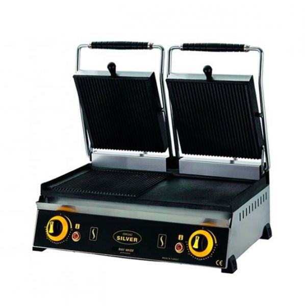 Двухпостовой гриль тостер имеет встроенный терморегулятор, который позволяет изменять температуру приготовления в диапазоне от 50-300°C. Модель оснащена лотком для сбора жира, корпус выполнен из нержавеющей пищевой стали, рифленные поверхности прижимные с чугуна, ручки выполнены из термостойкого материала.