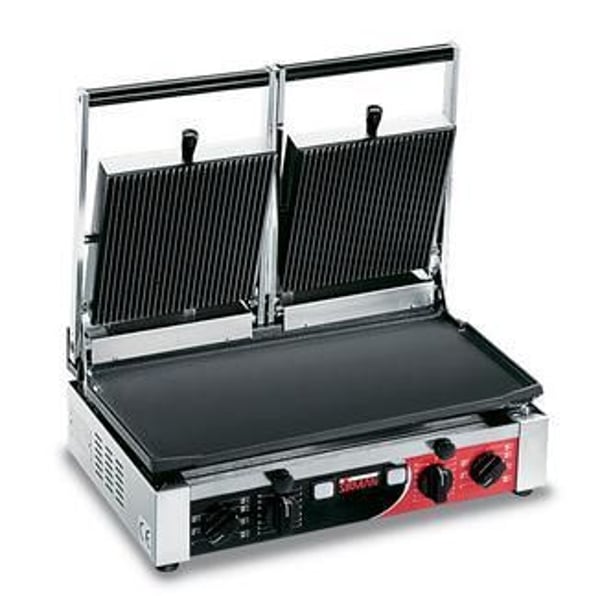 Профессиональный прижимной гриль благодаря регулируемому термостату температуры 0÷300 °C, позволяет быстро приготовить сэндвичи различной сложной начинки, горячие бутерброды, овощи-гриль,поджарить тосты и сосиски хот-дог.