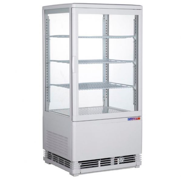 Профессиональная холодильная витрина имеет 4 прочные и устойчивые хромированные полки, которые легко регулируются по высоте, стекло изогнутое двойное, дверца расположена сзади и легко открывается.