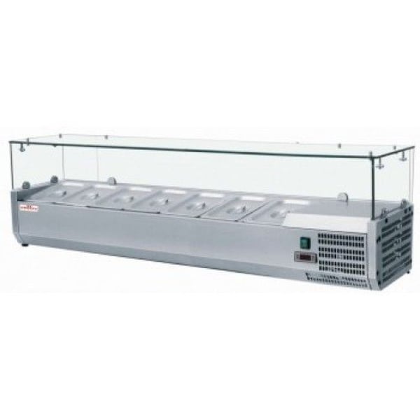Холодильная витрина для хранения начинки предназначены для кратковременного хранения и демонстрации,предварительно охлажденных продуктов (заготовок, салатов, закусок, гарниров) в магазинах, кафе, барах, ресторанах, суши-барах. Чаще всего применяются в пиццериях для хранения начинки для пиццы. Эту витрину для топпинга удобно установить прямо на холодильный стол для пиццы. Вместимость холодильной витрины - 8 гастроемкостей GN 1/4 глубиной. С тыльной стороны удобный доступ к выставляемым блюдам. Витрина выполнена из нержавеющей стали с алюминиевым анодированным профилем, без раздвижной стеклянной дверки. Температурный режим +2...+8°C, статическое охлаждение, защитное стекло.