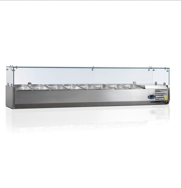Настольные барные витрины - предназначены для кратковременного хранения и демонстрации, предварительно охлажденных продуктов (салатов, закусок, гарниров) в магазинах, кафе, барах, ресторанах, суши-барах. Наиболее широко применяются в пиццериях для хранения топпинга (начинки для пиццы).Витрины выполнены из нержавеющей стали. Статическое охлаждение. Защитное стекло.