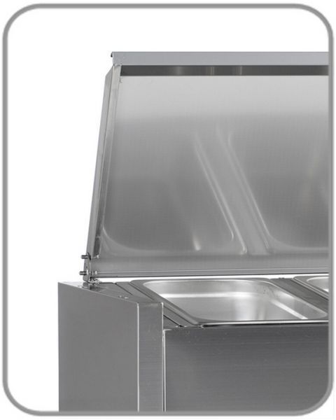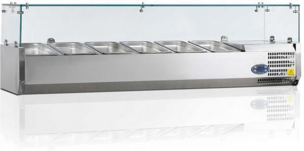 Настольные барные витрины - предназначены для кратковременного хранения и демонстрации, предварительно охлажденных продуктов (салатов, закусок, гарниров) в магазинах, кафе, барах, ресторанах, суши-барах. Наиболее широко применяются в пиццериях для хранения топпинга (начинки для пиццы).Витрины выполнены из нержавеющей стали. Статическое охлаждение. Защитное стекло.