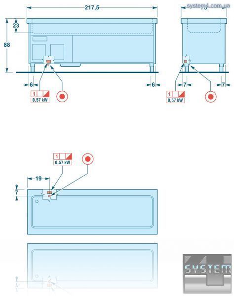 • охлаждаемые емкости, рабочая температура +2...+12 °C, высота 200 мм, вмещает около 130 бутылок 0,5л. в 4 х 1/1 GN, и около 200 в 6 х 1/1 GN;