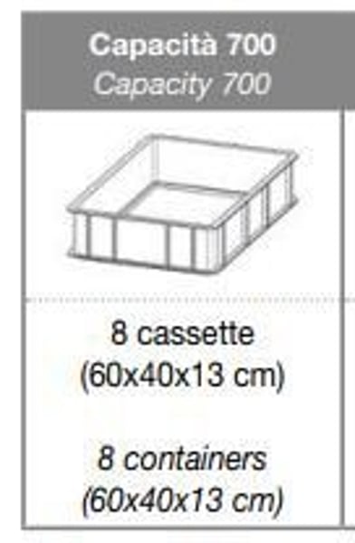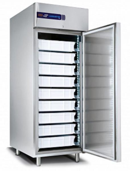 Снабжен эргономичной ручкой во всю высоту холодильника конструктивно выдвинутой от дверцы, для быстрого и легкого его открывания, также присутствует циркулятор, который гарантирует хранящимся продуктам уникальную свежесть. Установка Euronorm с пластиковыми лотками 600x400 мм и ложными перфорированными днищами из нержавеющей стали AISI 304.