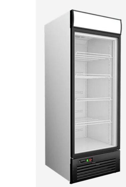 Одна стеклянная дверь с автоматическим блокирующим устройством. Рабочая температура составляет +1ºC...+10ºC при комнатной температуре +35ºC, объем шкафа 590л, 4 полки-решетки покрытые полимерной краской с максимальной нагрузкой 50кг, толщина термоизоляции 60 мм.