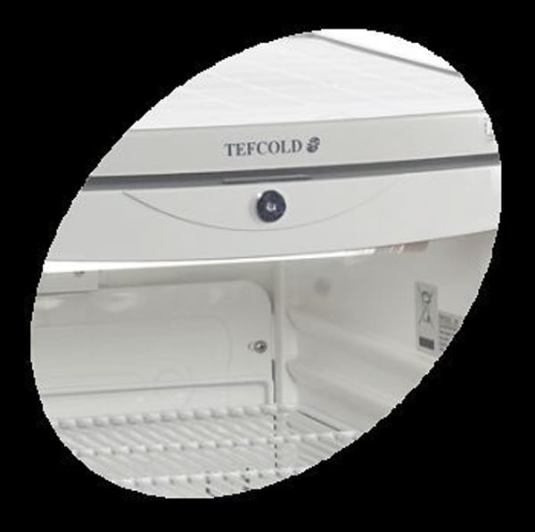 Застекленная конструкция двери и внутреннее освещение камеры выгодно предоставит выкладку товара и тем самым наглядно позволит определить место расположение нужного продукта, не открывая дверцу - это позволяет сохранить внутренний температурный режим морозильной камеры Tefcold.