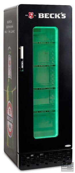 Внутреннее освещение и стеклянные стенки двери выгодно предоставит выкладку товара и тем самым наглядно позволит определить место расположение нужного продукта, не открывая дверцу - это позволяет сохранить внутренний температурный режим холодильного шкафа для напитков.