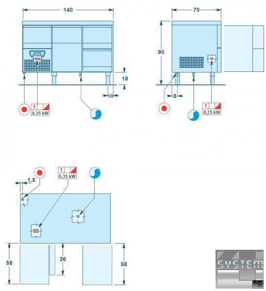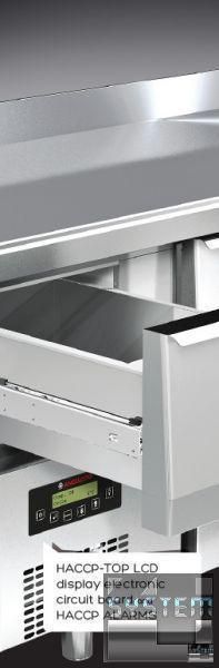 Холодильные столы Angelo Po линейки 6TE - столы со встроенными холодильными агрегатами глубиной 70 см с выдвижным ящиком GN 1/1, который расположен на холодильном блоке, что увеличивает емкость данного оборудования. Объем ящика 24,6 л, размеры: 30,5x54,8x14,7 см.