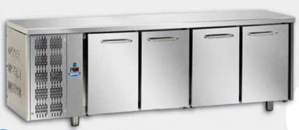 Холодильный стол DGD TF04EKOGN оборудован четырьмя дверьми, в каждом отделении по одной полке GN1/1, термоизолятором толщиной 40мм, автоматическая разморозка в каждом отделении, столешница из нержавеющей стали, полезный объем - 620 л.