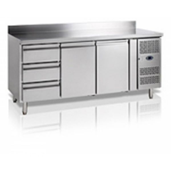 Холодильный стол DGD TF04EKOGNAL+C31+C32 дополнительно оборудован бортом на 100 мм, четыре отделения (6 ящиков 1/3 вместо первой и второй двери), 2 двери + в каждом отделении по одной полке GN1/1, термоизолятором толщиной 40 мм, автоматическая разморозка в каждом отделении, столешница из нержавеющей стали, полезный объем - 620 л.