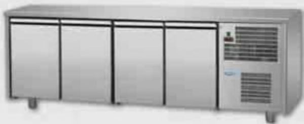 Стол холодильный с четырьмя распашными дверьми с возвратным механизмом, также подогрев по контуру двери препятствует образования конденсата.