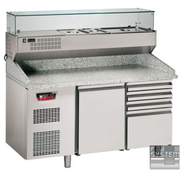 BPZ167B - холодильный стол для пиццы с одним холодильным отделением, одной нейтральной тумбой с 3 ящиками и 1 большим ящиком с полезной высотой 350 мм, 1 охлаждаемой витриной для наполнителей 37 см глубиной и гранитной поверхностью.