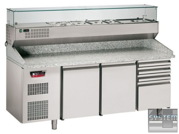 BPZ203B - холодильный стол для пиццы с одним холодильным отделением с двумя дверями , одной нейтральной тумбой с 3 ящиками и 1 большим ящиком с полезной высотой 350 мм, 1 охлаждаемой витриной для наполнителей 33 см глубиной и гранитной поверхностью.