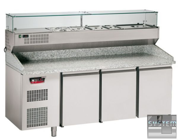 BPZ203S - холодильный стол для пиццы с одним холодильным отделением с тремя дверями , 1 охлаждаемой витриной для наполнителей 33 см глубиной и гранитной поверхностью.