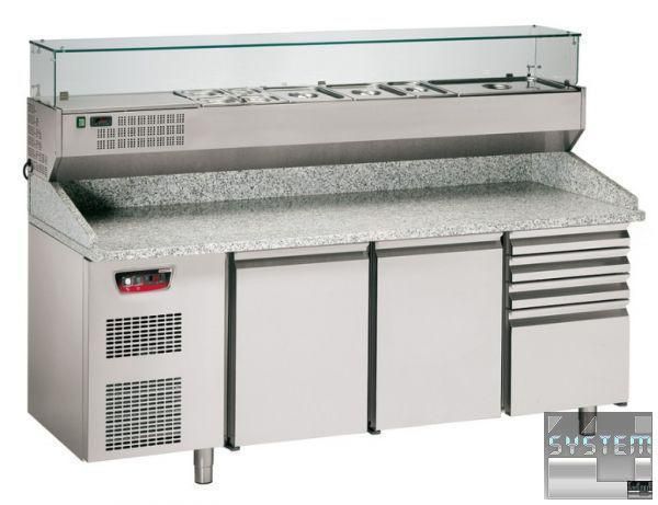 BPZ207B - холодильный стол для пиццы с одним холодильным отделением с двумя дверями , одной нейтральной тумбой с 3 ящиками и 1 большим ящиком с полезной высотой 350 мм, 1 охлаждаемой витриной для наполнителей 37 см глубиной и гранитной поверхностью.