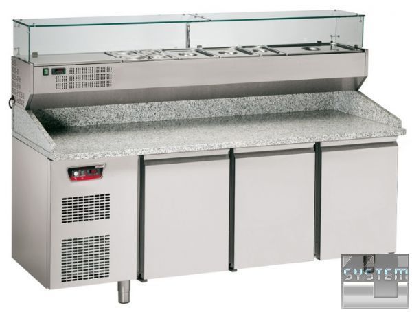 BPZ207S - холодильный стол для пиццы с одним холодильным отделением с тремя дверями , 1 охлаждаемой витриной для наполнителей 37 см глубиной и гранитной поверхностью.