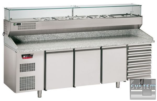 BPZ253A - холодильный стол для пиццы с одним холодильным отделением с тремя дверями , одной нейтральной тумбой с 7 ящиками, 1 охлаждаемой витриной для наполнителей 33 см глубиной и гранитной поверхностью.