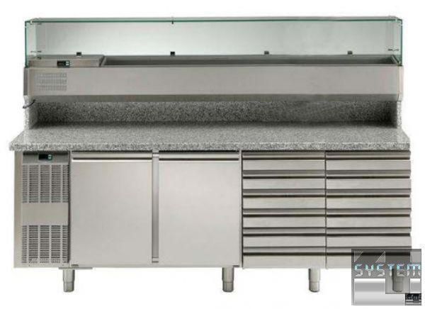 Холодильный прилавок Electrolux 727149, с надставной витриной для ингредиентов, гранитная столешница, 2 двери и 12 выдвижных ящиков 1/3, объёмом 420л., температурный режим работы 0…+10°С, система автоматической разморозки и испарения, изоляция толщиной 50мм., цифровой дисплей, в комплекте 2 полки решетки GN 1/1 (до 6 на одно отделение), климат класс +43°С (+32°С для витрины), исполнение нерж. сталь AISI 304