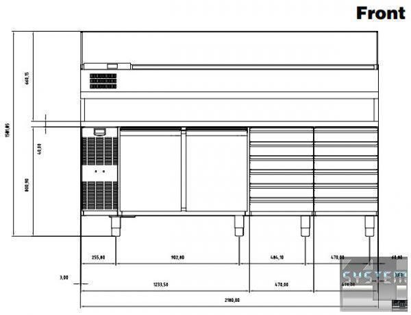 Профессиональный стол с охлаждением имеет габаритные размерами: 2180мм (длина), 700мм (глубина), 1501мм (высота).