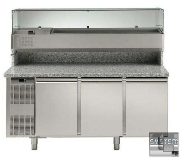 Холодильный прилавок Electrolux 727150, трёхдверный с надставной витриной для ингредиентов, гранитная столешница, объёмом 420л., температурный режим работы 0…+10°С, система автоматической разморозки и испарения, изоляция толщиной 50мм., цифровой дисплей, в комплекте 3 полки решетки GN 1/1 (до 6 на одно отделение), климат класс +43°С (+32°С для витрины), исполнение нерж. сталь AISI 304