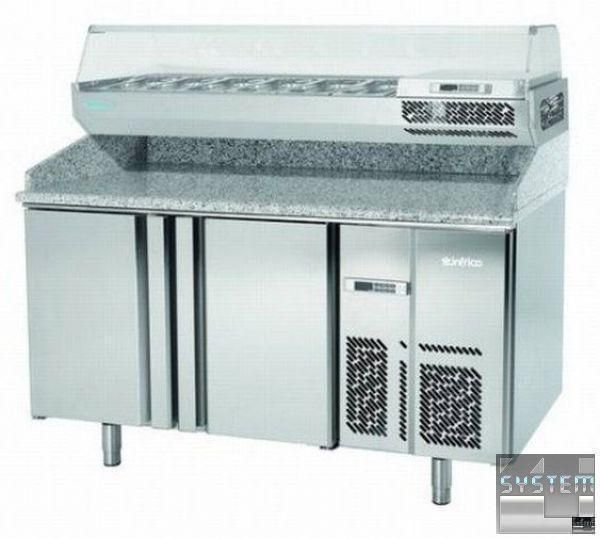 Холодильный стол с гранитной поверхностью, на 2 двери, с 3-х сторонним бортом, встроенная независимая витрина для ингредиентов, температурный режим стола 0/+6С, электронная панель управления, автоматическая розморозка, вместимость стола 295 л, вместимость витрины 35 л., вентилируемые камеры, климатический класс +43С, гигиеническое исполнение, материал исполнения пищевая нерж. сталь.