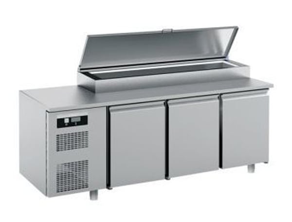 - Рабочая поверхность из нержавеющей стали AISI 304, охлаждаемый поддон с шарнирной крышкой из нержавеющей стали AISI 304 с поверхностью для порционирования из пищевого нейлона (KBP41X). Включена пара направляющих из нержавеющей стали AISI 304 для вставления в шкафчик гастроемкостей GN 1/1.