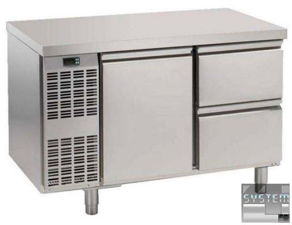 Холодильный стол Electrolux 728139, без борта объёмом 265л., температурный режим работы -2…+10°С, 1 дверь и 2 выдвижных ящика 1/2, система автоматической разморозки и испарения, изоляция толщиной 50мм., цифровой дисплей, в комплекте 1 полка решетка GN 1/1 (до 6 на одно отделение), климат класс +43°С, слив, скруглённые углы, исполнение нерж. сталь AISI 304