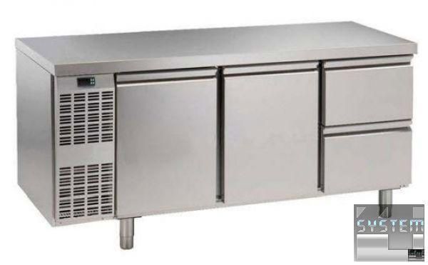 Холодильный стол Electrolux 728235, без борта, объёмом 420л., температурный режим работы -2…+10°С, 2 двери и 2 выдвижных ящика 1/2, система автоматической разморозки и испарения, изоляция толщиной 50мм., цифровой дисплей, в комплекте 2 полки решетки GN 1/1 (до 6 на одно отделение), климат класс +43°С, слив, скруглённые углы, исполнение нерж. сталь AISI 304