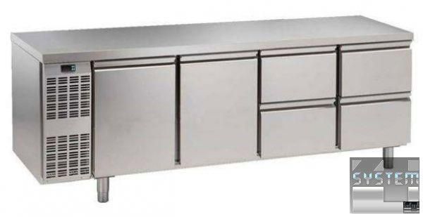 Холодильный стол Electrolux 728245, без борта, объёмом 560л., температурный режим работы -2…+10°С, 2 двери и 4 выдвижных ящика 1/2, система автоматической разморозки и испарения, изоляция толщиной 50мм., цифровой дисплей, в комплекте 2 полки решетки GN 1/1 (до 6 на одно отделение), климат класс +43°С, слив, скруглённые углы, исполнение нерж. сталь AISI 304
