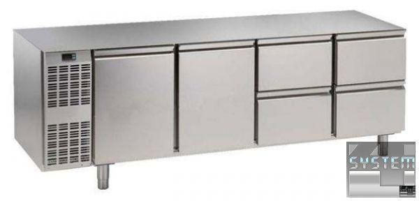Холодильный стол Electrolux 728565, без столешницы объёмом 560л., температурный режим работы -2…+10°С, 2 двери и 4 выдвижных ящика 1/2, система автоматической разморозки и испарения, изоляция толщиной 50мм., цифровой дисплей, в комплекте 2 полки решетки GN 1/1 (до 6 на одно отделение), климат класс +43°С, слив, скруглённые углы, исполнение нерж. сталь AISI 304