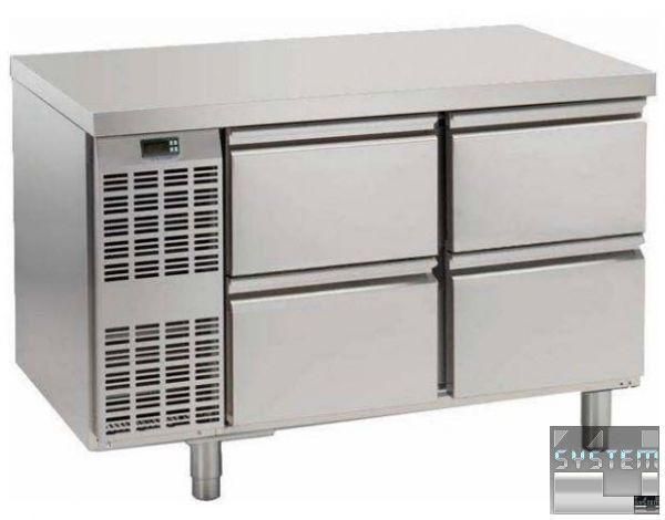 Холодильный стол Electrolux 728158, без борта, объёмом 265л., температурный режим работы -2…+10°С, 4 выдвижных ящика 1/2, система автоматической разморозки и испарения, изоляция толщиной 50мм., цифровой дисплей, климат класс +43°С, слив, скруглённые углы, исполнение нерж. сталь AISI 304