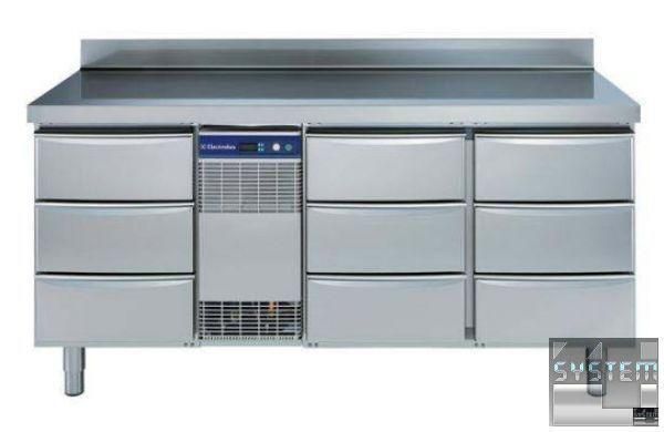 Холодильный стол Electrolux 727087, с бортом 100 мм, объёмом 440л., 9 выдвижных ящиков 1/3, температурный режим работы -2…+10°С, система автоматической разморозки и испарения, изоляция толщиной 60мм., электронное микропроцессорное управление с дисплеем, климат класс +43°С, скруглённые углы, модульная конструкция дверей, пониженное энергопотребление, исполнение нерж. сталь AISI 304