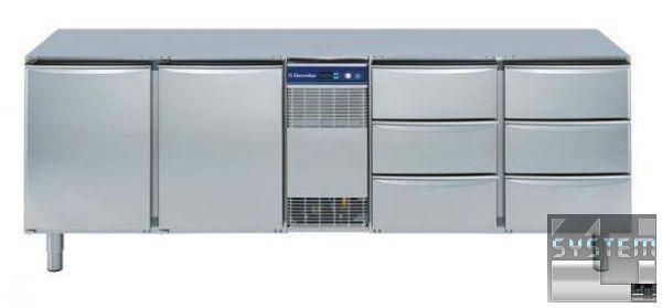 Холодильный стол Electrolux 727085, без столешницы, объёмом 590л., 2 двери и 6 выдвижных ящика 1/3, температурный режим работы -2…+10°С, система автоматической разморозки и испарения, изоляция толщиной 60мм., электронное микропроцессорное управление с дисплеем, в комплекте 2 полки решетки GN 1/1 (до 4 на одно отделение), климат класс +43°С, скруглённые углы, модульная конструкция дверей, пониженное энергопотребление, исполнение нерж. сталь AISI 304