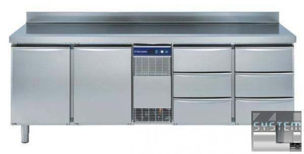 Холодильный стол Electrolux 727086, с бортом 100 мм, объёмом 590л., 2 двери и 6 выдвижных ящика 1/3, температурный режим работы -2…+10°С, система автоматической разморозки и испарения, изоляция толщиной 60мм., электронное микропроцессорное управление с дисплеем, в комплекте 2 полки решетки GN 1/1 (до 4 на одно отделение), климат класс +43°С, скруглённые углы, модульная конструкция дверей, пониженное энергопотребление, исполнение нерж. сталь AISI 304