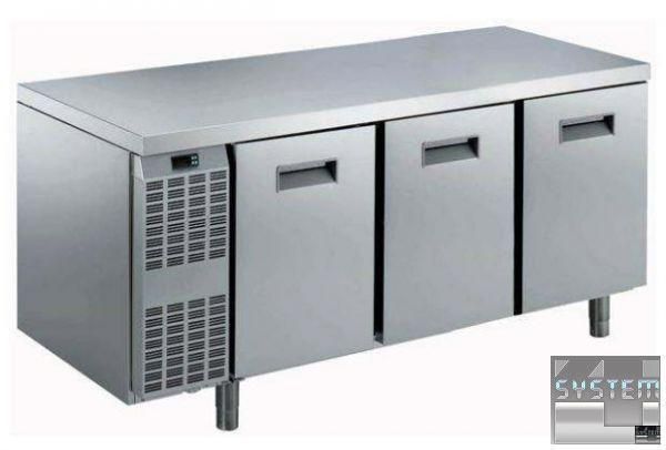 Холодильный стол Electrolux 727007, трёхдверный без борта, объёмом 415л., температурный режим работы -2…+10°С, система автоматической разморозки и испарения, изоляция толщиной 50мм., цифровой дисплей, в комплекте 3 полки решетки GN 1/1, климат класс +43°С, исполнение нерж. сталь