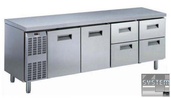 Холодильный стол Electrolux 726170, без борта объёмом 560л., температурный режим работы -2…+10°С, 2 двери и 4 выдвижных ящика 1/2, система автоматической разморозки и испарения, изоляция толщиной 50мм., цифровой дисплей, в комплекте 2 полки решетки GN 1/1, климат класс +43°С, исполнение нерж. сталь AISI 304
